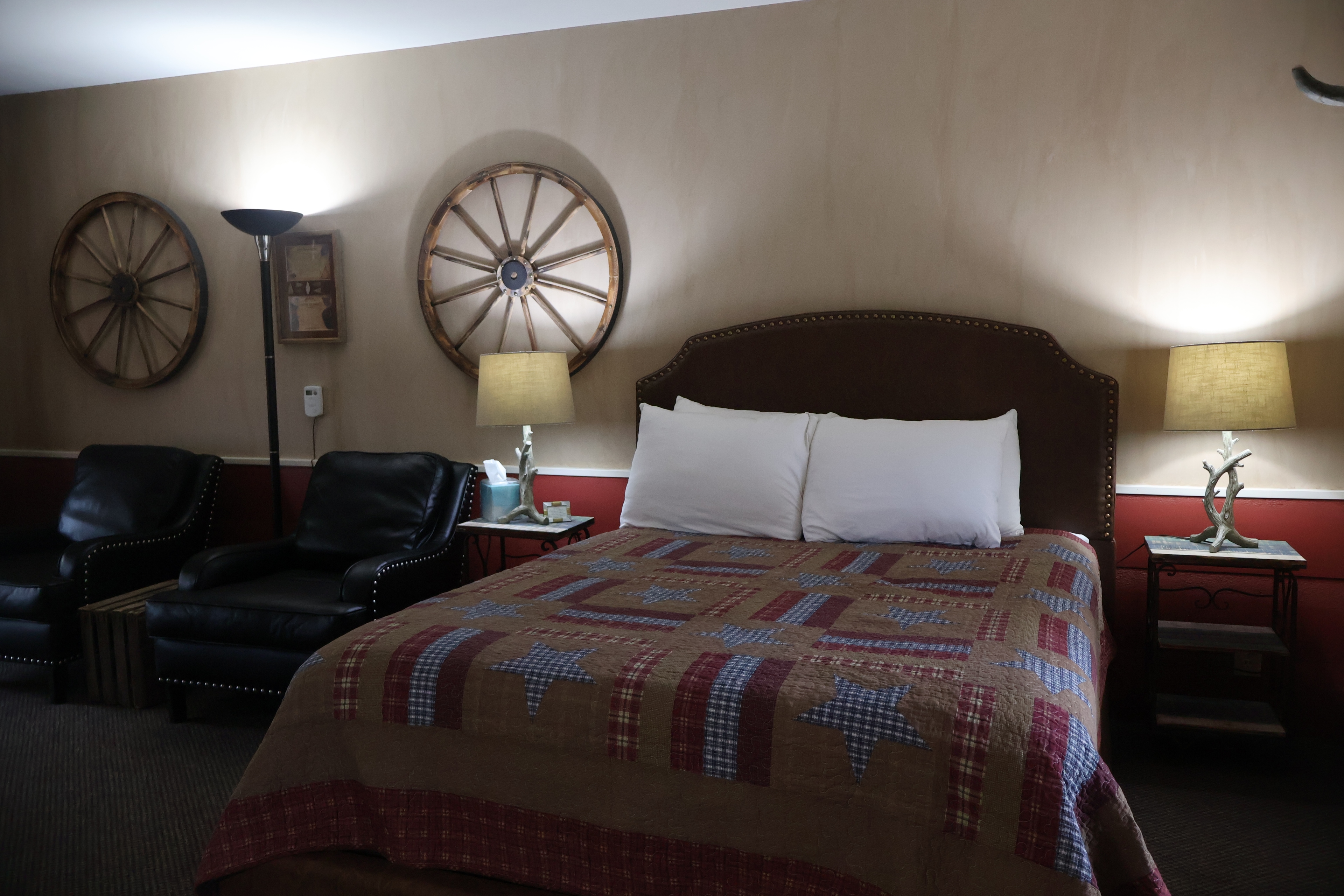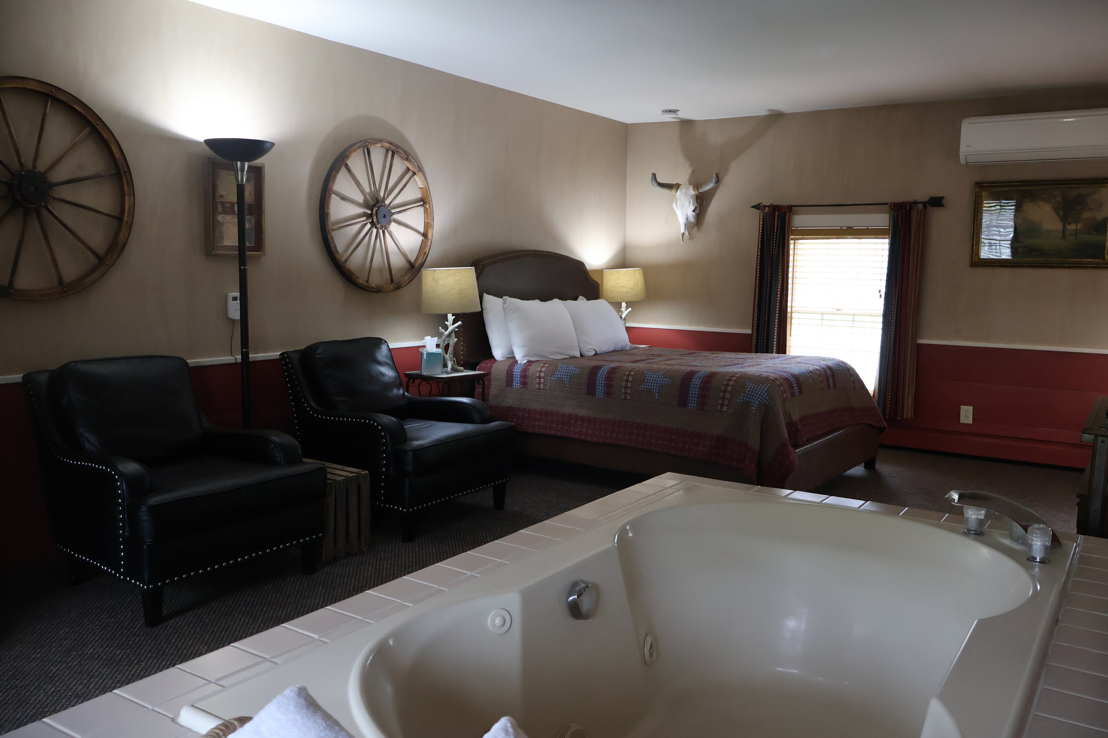 Located on the second floor, up a flight of 19 steps, George's Jacuzzi Room sleeps 2 and features a gas Franklin stove with glass front and a 2-person Jacuzzi tub in the bedroom. There are two comfortable chairs in a seating area near the fireplace. The room is decorated with a sportsman's lodge theme using hunting and fishing wall hangings. Please note: there are no real stuffed animals hanging on the walls.